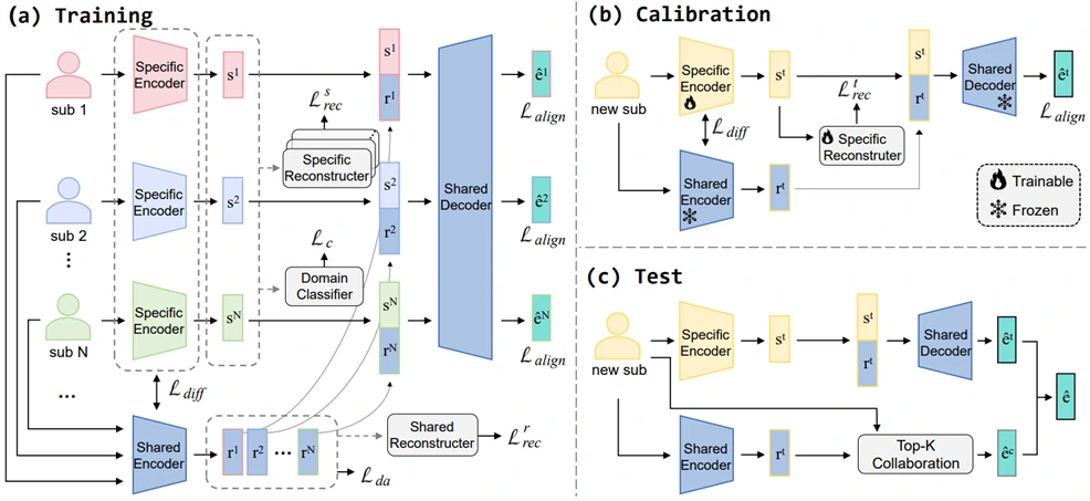 如图2所示, MindCross包含三个阶段:训练、校准和测试。在训练阶段,使用所有N个被试的数据训练N个特定编码器和一个共享编码器。如果出现数据有限的新受试者,则在校准阶段训练一个新的特定编码器,同时MindCross中的其他模块则保持冻结状态。也就是说,校准阶段只更新新的特定编码器和重构器,从而大大加速了适应新被试的调试速度。在测试阶段,新受试者的最终输出由其自身的特定编码器和一个Top-K协作模块获得。