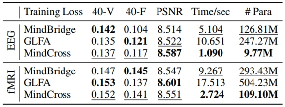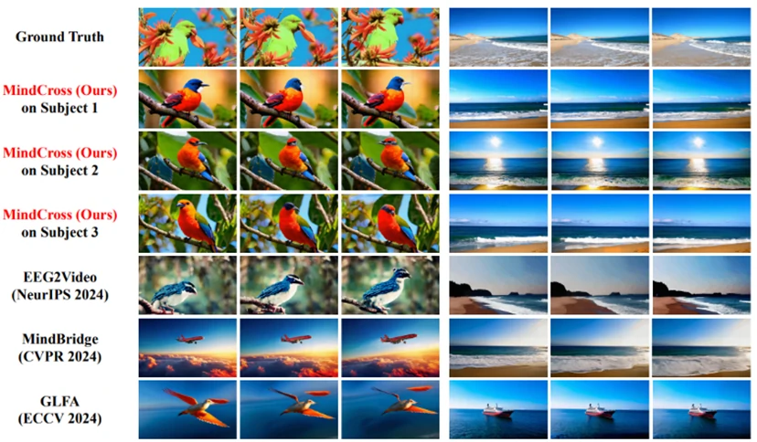 从表1可以看出MindCross方法在语义层面上仅使用一个模型,即可达到与基于每个被试每个模型的方法相当的性能,并且略优于其余跨被试解码方法。表2更是说明了在适应数据较少的新被试时,MindCross显著减少了适应时间和更新参数(尤其是在受试者数量较大时),同时优于或与基线持平,证明了 MindCross 在新受试者适应方面的优越性。图3和图4展示了一些定性结果的比较。