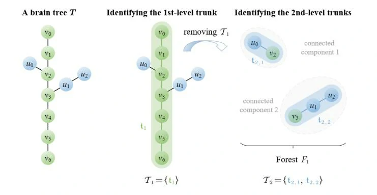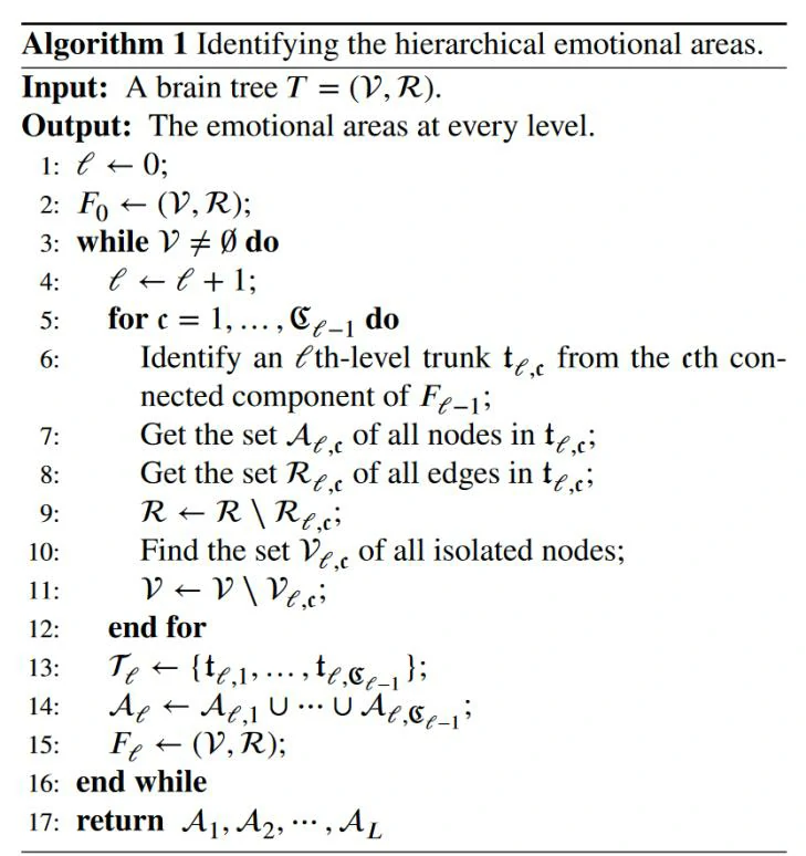 作者将整个大脑树分解成分层的主干,并利用它们来识别分层的情绪区域。具体来说,作者将最长的最短路径指定为第1级主干t1。剩下的第lth(l≥2)级的主干t l被认为是整个脑树的一个分支,在第lth级通常有多个分支。作者将第l级的主干集表示为T l,与该主干上所有节点相对应的脑区构成了主要情绪区,表示为A1。将主干移除,剩余的部分便组成了一个森林。这个森林包含至少一个(通常是多个)连接的组件,每个组件都是一棵(子)树。为了识别第l(l≥2)级的树干,作者在移除所有先前(l−1)级的树干后,在森林的每个连接组件中搜索最长的最短路径。类似地,与这些第l级干上的所有节点相对应的大脑区域构成了第l级情绪区域,表示为l。此过程迭代运行,并在删除树中的所有节点后结束。这一过程用伪代码和图例表示如下: