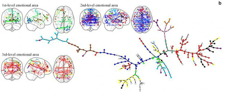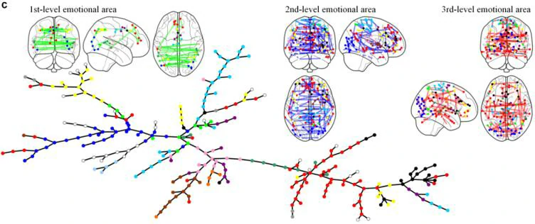 为了识别分层情绪区域,作者在数据集1上进行实验,并使用Power Atlas来定义ROI。功率图谱包括分布在13个功能系统和一个不确定系统中的264个假定功能区域(即ROI)。随后,构建大脑网络并提取大脑树,识别分层情绪区域。下图展示了所有基本情绪的整体体验的识别结果,以及最具代表性的积极和消极情绪(快乐和悲伤)的单一体验的识别结果, 节点根据图例着色,1级、2级和3级情绪区域内的内部联系分别用绿色、蓝色和红色突出显示: