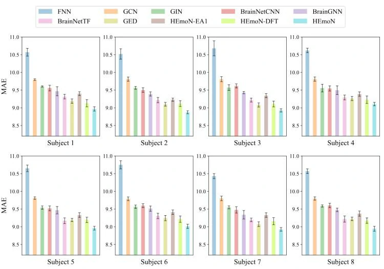最后,将HEmoN与多个竞争基线进行了比较,包括全连接神经网络(FNN)、图卷积网络(GCN)、图同构网络(GIN)、BrainNetCNN、BrainGNN、脑网络转换器(BrainNetTF)和图增强情绪解码(GED)。比较结果如下图所示。