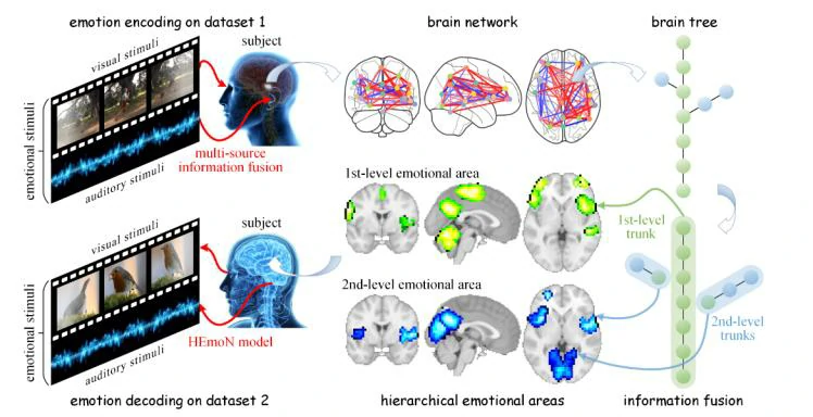以往的研究中对于大脑区域之间的关系采用的方法通常只模拟两个大脑区域之间的成对关系,而忽略了多个大脑区域之间的相互作用和信息融合——这是心理建构主义假说的关键思想之一。为了研究情绪背后的大脑机制(即情绪编码),作者首先测量和收集受试者在经历视听多源情绪刺激时的大脑信号,利用收集到的fMRI信号构建一个大脑网络,并从这个大脑网络中提取一棵大脑树。然后,将整个大脑树分解为不同级别的主干(即分层主干),每个主干促进大脑区域之间的信息融合。在分解之后将脑树中的这些分层主干恢复到人脑中的分层情绪区域,完成给定数据集上分层情绪区域的识别。最后,使用所提出的模型HemoN(建立在前述识别的分层情绪区域上),在其他具有挑战性的数据集上执行跨数据集情绪解码。结果表明,所识别的分层情绪区域,从较低到较高,主要促进情绪感知的基本过程、基本心理操作的构建以及这些操作的协调和整合。总的来说,作者的发现为基于心理建构主义假设的特定情绪背后的大脑机制提供了独特的见解。模型整体实现如下图所示: