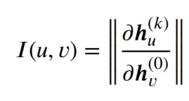 定义1(节点影响):在随机游走的k步之后,节点v对节点u的节点影响I(u,v)被定义为雅可比矩阵∂h(k)u/∂h(0)v的范数: