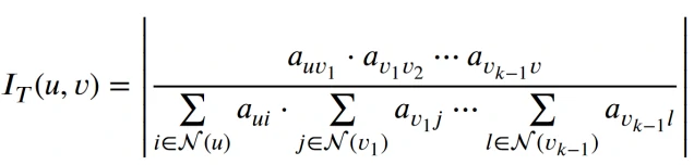 定理1:给定一棵树T,在随机游走的k=dist(u,v)步之后,节点影响节点v的IT(u,v)对节点u的影响为: