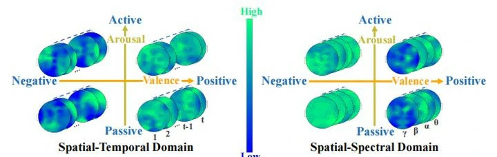 (1)如何有效的利用时-频-空域信息的互补性。生理信号空间域中的时域信息和频域信息通常具有不同的激活程度。例如,图1显示了不同情绪状态下EEG信号在空间域中时域和频域特征的差异。具体来说,在时空域中,时域信息的激活程度直接反映了大脑的活动。高激活度通常与积极情绪有关,低激活度通常与消极情绪有关。在频空域中,波段的激活度通常在消极情绪中较高,在积极情绪中较低。