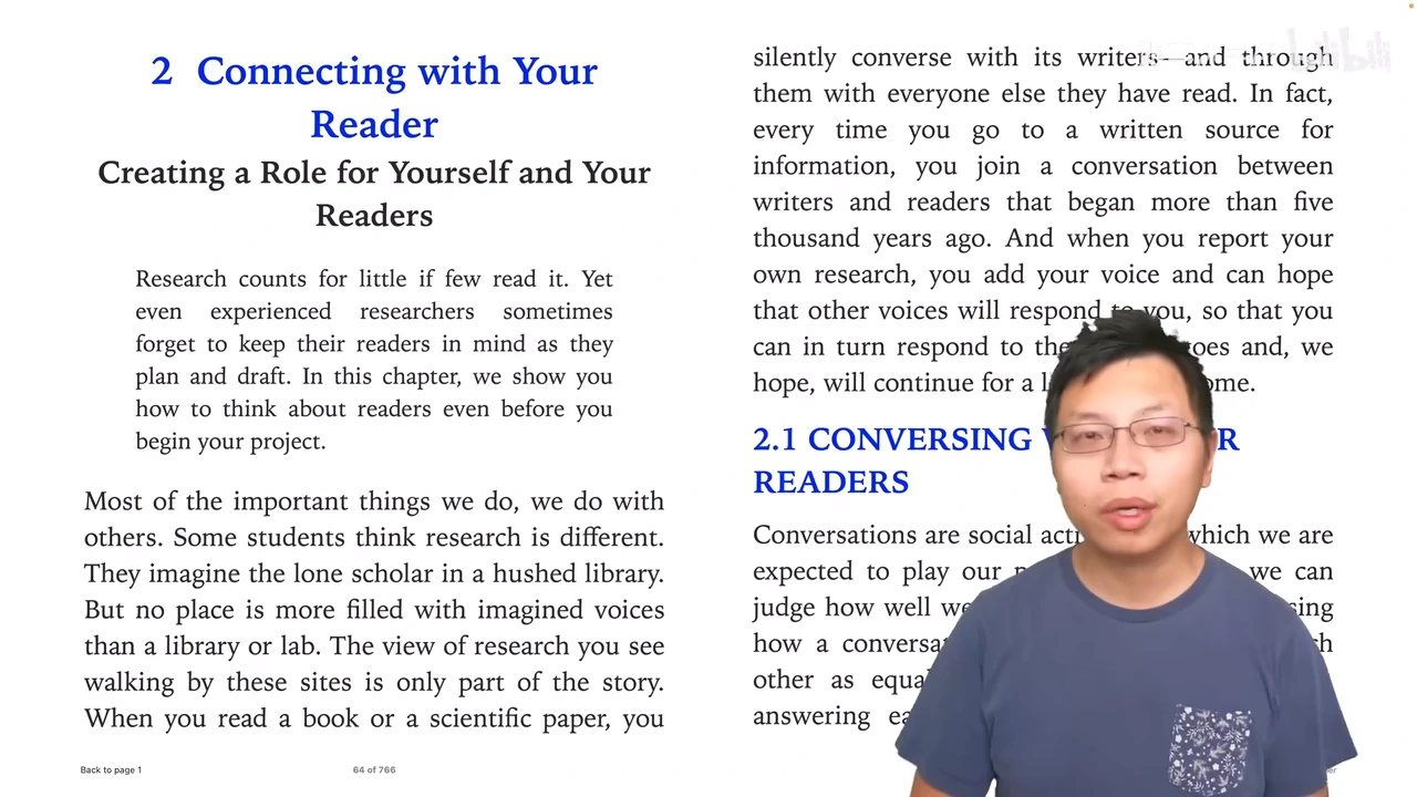 - 大部分重要的事情,通常是要跟别人一起来合作完成的,作者反驳了大众对研究人员的刻板印象之后,提出了:读书或读论文时其实是跟作者的无声交流,写作也一样,是将自己的“声音” 写进文字里
