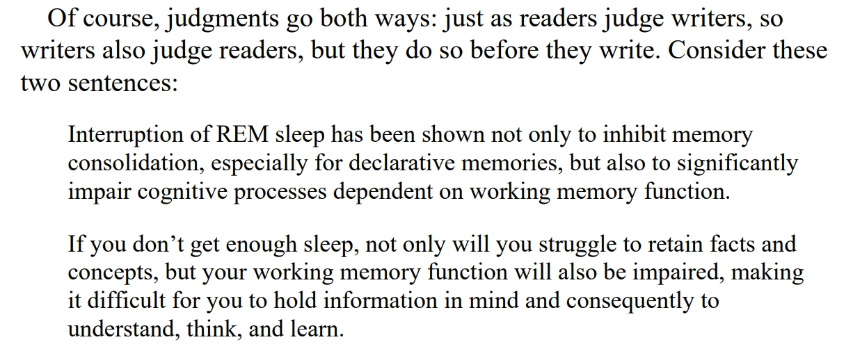 - 在关于读者读a的文章的例子中,应该在开始的时候,就带入读者的身份,思考读者可能会困惑的地方,然后适当的去调整一些论文,以下通过关于快速眼动期的例子,来说明这一点