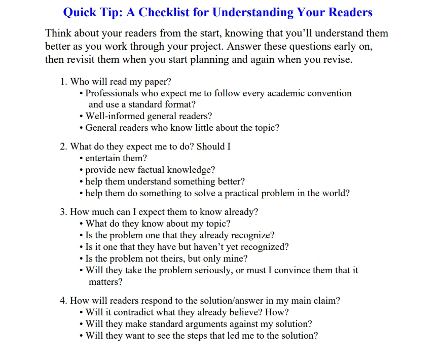 第一部分,提出了一个核心的观点:在写作的时候,永远要知道你的读者是谁,他们想要知道什么