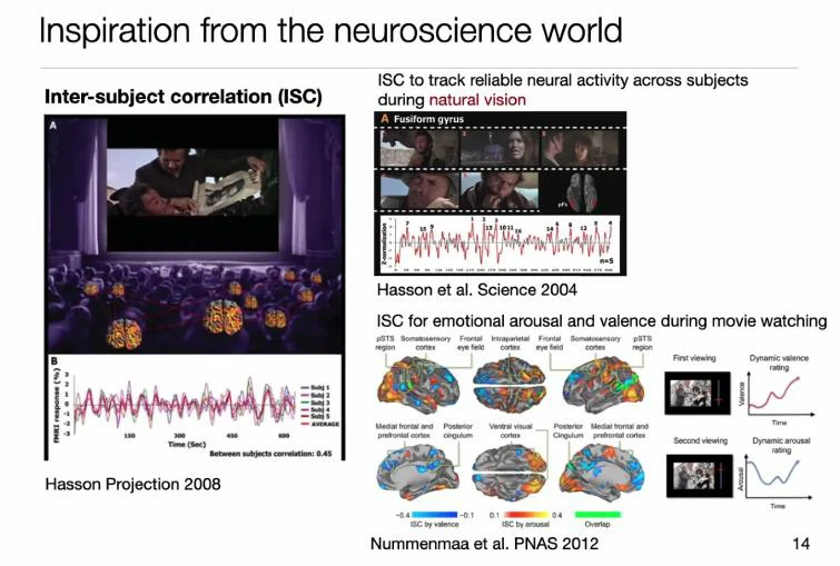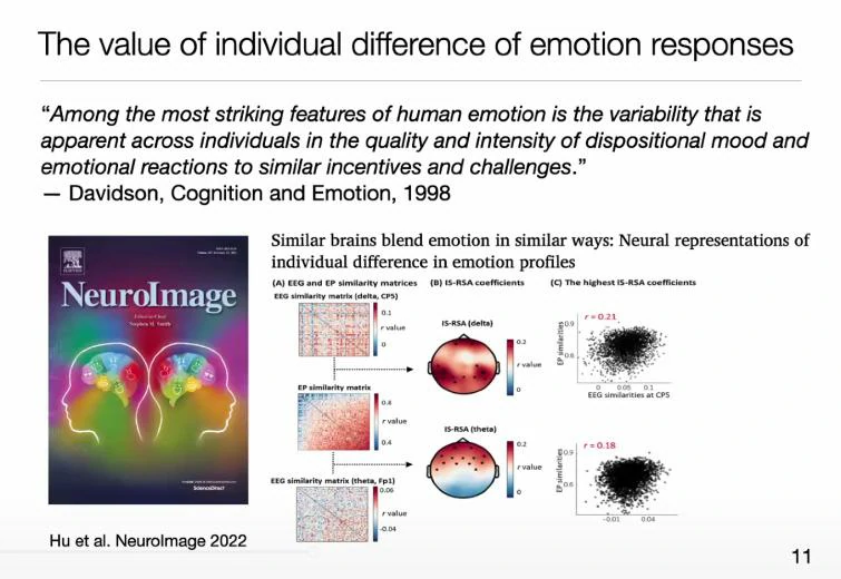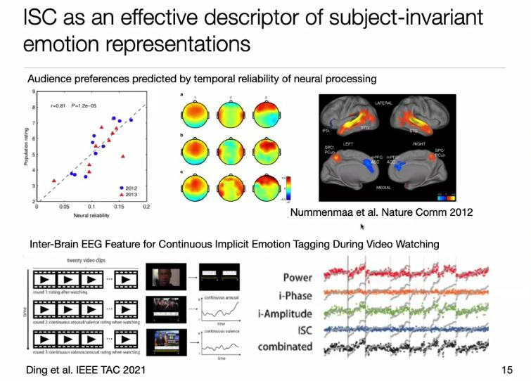 另一种角度来看,不单单从脑电强度出发,人们在对同一事件的脑电相应的一致性也能反应情绪的不同。人与人之间脑电强弱不一定相同,但对同一事件的大脑相应区域是类似的,说明这种人的神经活动一致性能够用来描述情绪的状态。这是张丹教授本次报告想要分享的重点。