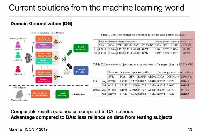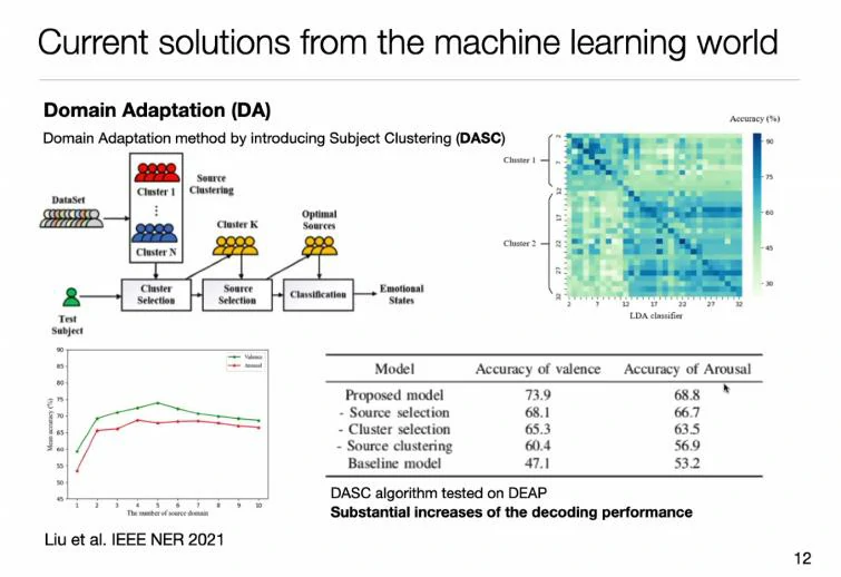 如果想做跨个体的情绪识别,张丹教授分享了两种方法:域适应(Domain Adaptation, DA)、域泛化(Domain Generalization, DG)。域适应方法是根据新数据在历史数据中的相似性,使用历史数据中与之相似性更高的来建立分类模型应用到新的个体。