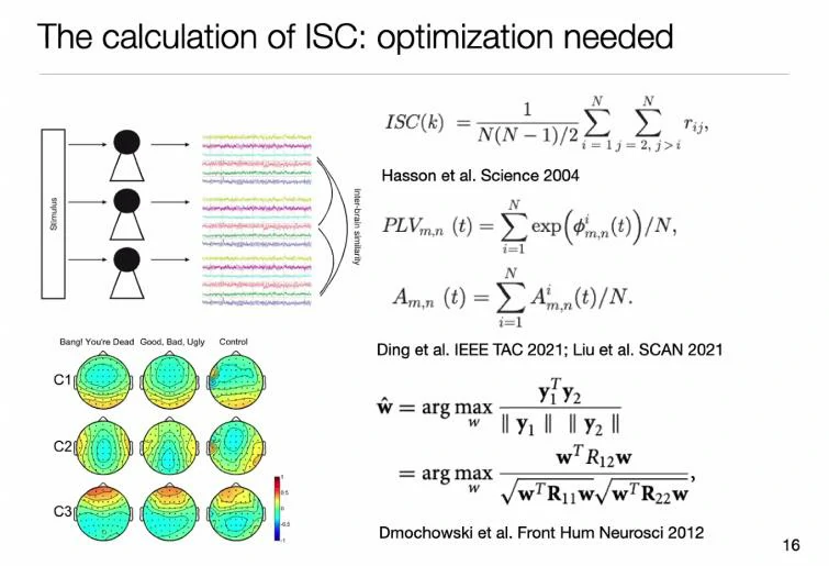 人与人之间脑电的相关性有多种计算方式。Hasson等仅计算了多人脑电之间的平均信息,张丹教授分享了其它的一些计算方式,例如计算相位响应和幅度响应、寻找关键成分来反应一致性表达。