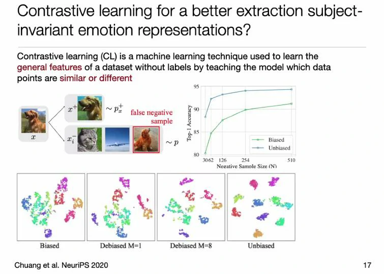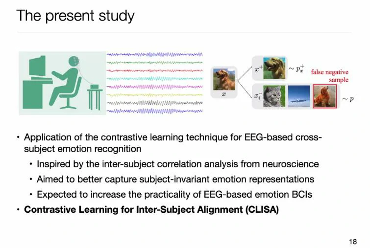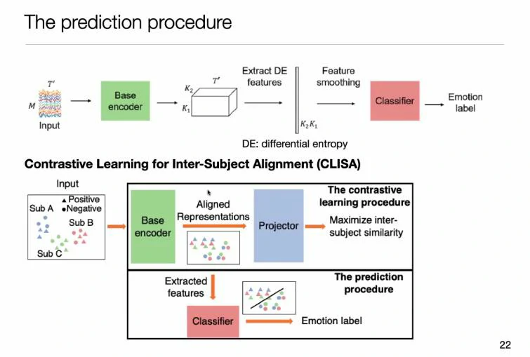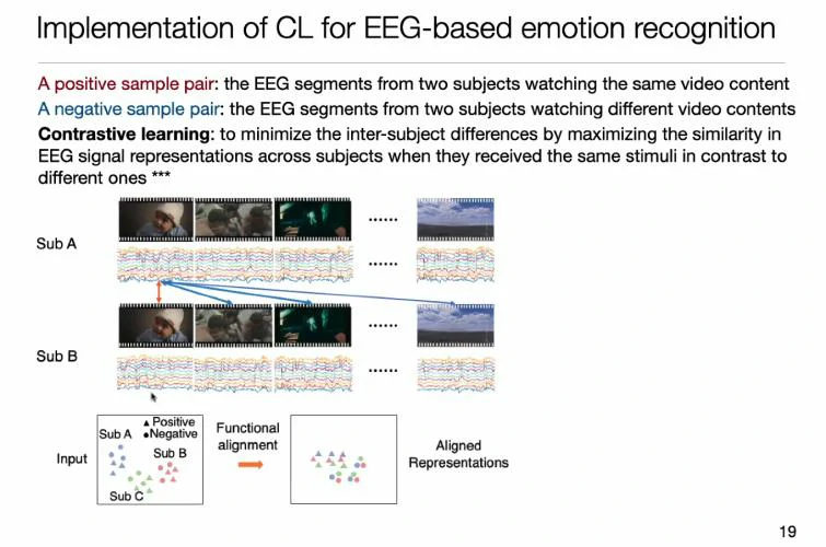 是否能用深度学习方法进行优化?如何更加关注个体间的一致性对情绪的贡献?张丹教授提出了基于对比学习的跨个体脑电情绪识别方法,该模型不再是学习样本到标签的特征,而是每次都是成对的正负样本进行呈现,标签仅作为判断正负样本的参考。这种方式更加接近于人类的学习方法,人去学习时并不是学习具体的标签,而是通过对比的方式总结出一类物体该有的特征。