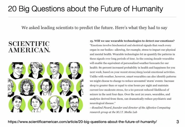 在2016年提出的面向未来的20大问题中,“Will we use wearable technologies to detect our emotion?”是其中的一大重点问题。张丹教授从可穿戴设备来检测情绪的可行性角度出发,再次说明了情绪识别的重要性。