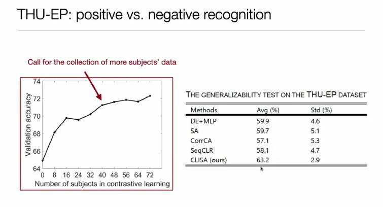 在效果验证上,更好的测试应该是使用诱发相同情绪的不同视频片段,而不是在训练中使用过的视频继续测试,这样能够更泛化地测试出模型的性能。在测试结果中,可以看出对比学习随着被试样本的增多,验证准确率有明显的提升。