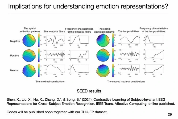 张丹教授最后总结到,通过时域卷积和空域卷积,能够更加可视化地看出大脑是以何种机制支持我们的情绪识别,能够更加符合生理预期形态的描述。在积极、中性、消极的情绪中的最大贡献成分里,空间分布是比较类似的,都集中在前额的不对称表达,不一样的是在时域频域表达上,大脑震荡的节律是在完全不同的频带上。张丹教授表示到,目前并不敢盖棺定论这其中的联系,但可以为以后的研究提供支撑。