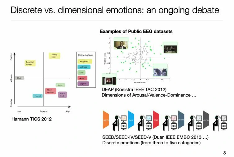 在这样的大背景下,传统的做法是将脑电数据打上对应的情绪标签,通过机器学习学到一个分类模型,这样的思路跟其它的分类模型是一致的。但其不像传统的语音识别、图像识别那么有确定性,情绪的标签是很微妙的,有很多个体化的因素在里面。标签体系的构建和诱发素材/诱发方法的建设是脑电情绪分类面临的挑战。