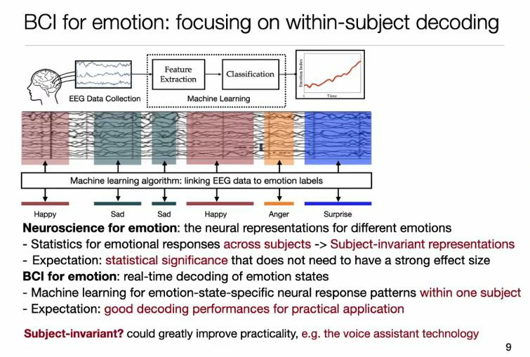 从脑机接口的发展来看,近年来关于情绪的脑机接口愈受人们关心,成为一个在脑机接口领域细分下来的新兴的、人们越来越重视的发展范式和发展方向。这个方向中,更关注的是情绪的被动识别,而不是传统脑机接口主动的控制。