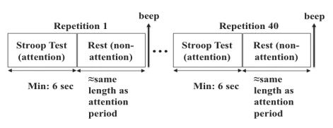 共有120名健康受试者进行了Stroop颜色测试[2,3],并从这些受试者中收集的脑电图数据作为该研究的研究数据。具体方法:在测试过程中,一个彩色的单词出现在屏幕上,受试者被要求说出这个单词的颜色。实验框图如图1所示:每位参与者重复进行40次实验,每次实验包括约6秒钟的Stroop测试(注意),以及同等时长的休息阶段(不注意)。Stroop测试界面如图2所示,界面上呈现的单词颜色和其含义不一致,要求受试者集中注意力,根据单词的颜色选择答案。在此过程中受试者经历了一种精神状态的变化(专注/不专注)。每个实验大约需要10分钟。为了更便捷的记录长时间的脑电数据,实验使用双极性、单通道的干电极头环设备,电极放置于额区(Fp1-Fp2)处,采样频率为256Hz。