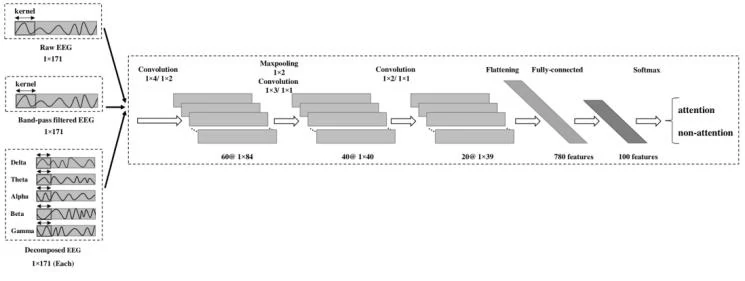 本研究提出的一个端到端的深度CNN框架,将脑电图分类为注意/非注意精神状态,解决了以下三个问题,分别是: 1)由于特征提取导致的信息丢失从而使分类精度下降 ; 2)跨被试迁移学习 ; 3)CNN学习内容的可解释性。