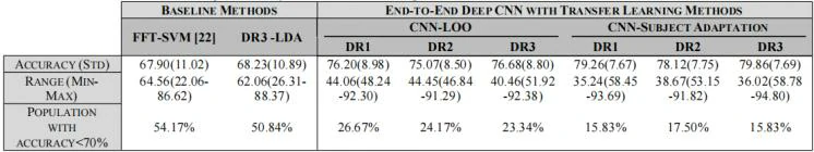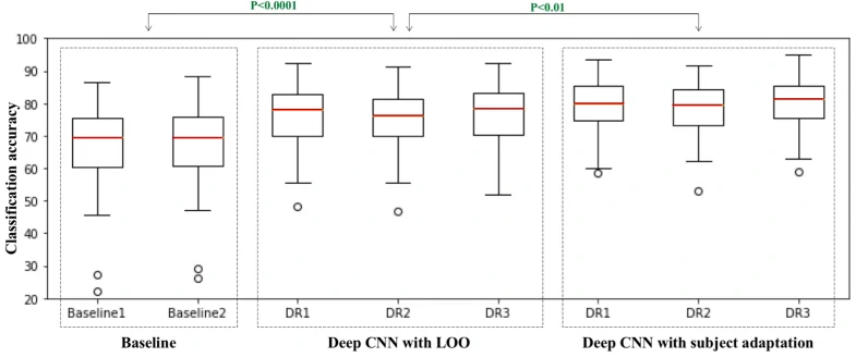 在本研究中,作者使用除目标受试者外的所有其他受试者的数据对网络进行训练,并用目标受试者数据来测试模型精度。该方法的精度明显优于基线,平均提高7.92%。如表1所示,DR1、DR2、DR3的平均准确率分别为76.20%、75.07%、76.68%,差异无统计学意义。该方法的准确率低于70%的受试者比例也显著下降,DR1、DR2和DR3的准确率在120个受试者中分别为26.67%、24.17%和23.34%。