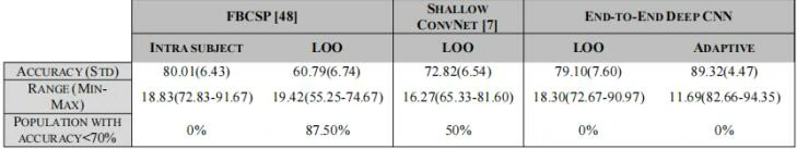 从表2中我们可以看出:基浅层卷积网络优于FBCSP方法,端到端深度CNN优于两种基线方法。