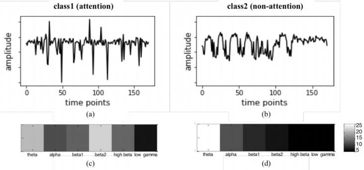 为了增强提出的端到端CNN模型学习到的内容的可解释性,作者使用激活最大化技术来可视化来自网络的感知输入。每个类对网络的感知如图6所示。图6(a)为第一类(注意)的网络感知,图6(b)为第二类(不注意)的网络感知。从图中我们看出注意类表现为高频振荡,而在非注意模式中这些分量消失。(a)和(b)中信号的功率谱密度,在包括alpha、beta1、beta2、高beta和低gamma在内的多个频带上,分别显示在(c)和(d)中。可以看到,随着精神状态从不专心(class2)到专心(class1)的变化: