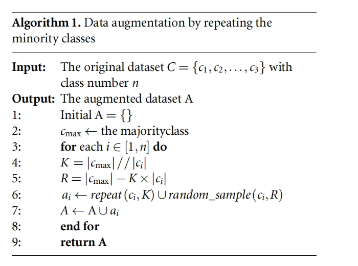 少数类的重复样本是一种简单的方法,通过简单地从少数类[2]中随机复制选定的样本。在训练过程中对该方法进行了验证。在我们的研究中,该过程如算法1所示。我们构建了具有所有样本具有平等机会来补偿少数类的增强数据集。