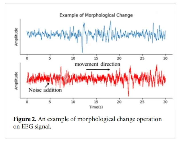 对于一个给定的睡眠脑电图历元,我们沿着时间轴进行了一个水平运动。我们还在生成信号中添加了白噪声,以进一步引入可变性。下图显示了这个操作的一个示例。通过对数据集产生新的方差,这些操作不会破坏原始脑电图信号的波特征。