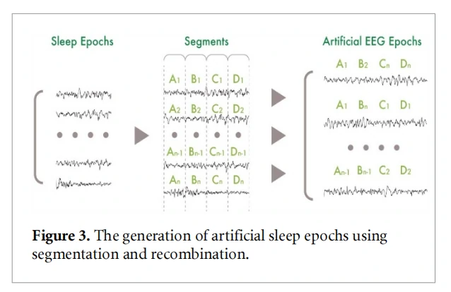 在BCI研究中,已经提出了几种有效的方法来解决这个问题,通过生成人工脑电图信号来增强其数据集我们通过在睡眠训练集上使用信号分割和重组策略来探讨这些关于睡眠分期任务的想法。DASR的基本思想是将30s的睡眠时代分为几个部分。然后,通过从同一类别中随机选择和重组的片段来产生新的睡眠时期。如下图所示: