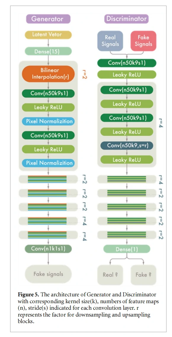 我们的GAN模型的架构如下图所示。该模型由两个对称网络、发生器和鉴别器组成。上采样块包含两个卷积神经网络(CNN)层和一个双线性插值块,将输入向量扩大到目标大小。除最后两个块外,每个块上的插值因子为2,其中我们使用因子4来降低输出维数和计算复杂度。相比之下,降采样过程是由CNN层实现的,步幅为2或4。每个CNN层后面都是LeakyReLu作为激活函数。特别地,我们在G中的CNN特征图上使用局部响应归一化来保持两个网络的大小匹配。