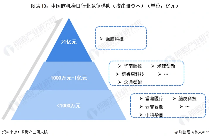 我国脑机接口行业正处于发展初期,行业内大部分企业规模较小。依据企业的注册资本划分,可以大概分为3个竞争梯队。其中,注册资本大于1亿元的仅强脑科技(Brainco)一家,注册资本在1000万以上的有华南脑控、念通智能、博睿康科技、术理创新等6家,其余企业注册资本均在1000万元以下。