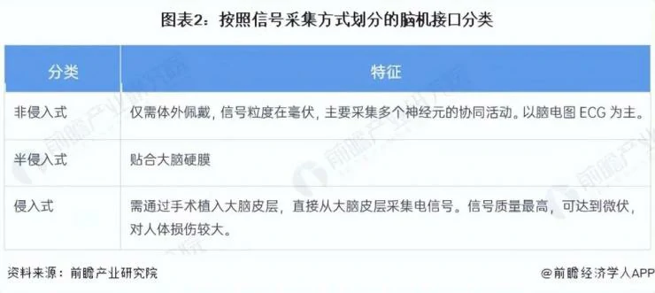 脑机接口的技术分类,按照信号采集方式划分,主要分为侵入式、非侵入式和半侵入式。侵入式指通过手术等方式直接将将芯片、传感器等硬件设备植入颅腔内或电极植入大脑皮层,获得高质量神经信号。非侵入式是指无需通过侵入大脑,只需通过附着在头皮上的穿戴设备对大脑信息进行记录和解读。半侵入式介于侵入式和非侵入式之间,将脑机接口植入到颅腔内,但是在大脑皮层外,降低了手术风险和免疫反应。