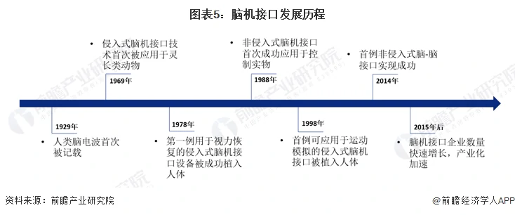 1929年,人类脑电波的存在首次被记载,为人类脑部活动研究开启了全新的可能性。1969年,侵入式脑机接口技术首次被应用于灵长类动物,这证明了大脑的神经可塑性。到1978年,第一例用于视力恢复的侵入式脑机接口设备被成功植入人体,这次尝试率先证实了脑机接口技术与仿生技术融合的可操作性,引领了用科技突破生理障碍的进一步探索。1988年,非侵入式脑机接口首次成功应用于控制实物。1998年,首例可用于运动模拟的侵入式脑机接口被植入人体。2014年,首例非侵入式脑-脑接口实现成功。