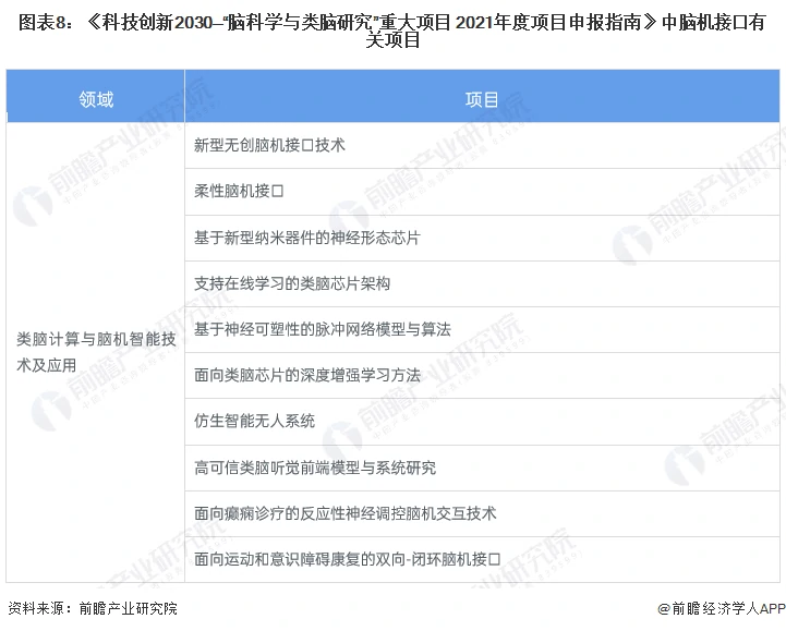 2021年9月,科技部发布了《科技部关于发布科技创新2030—“脑科学与类脑研究”重大项目 2021年度项目申报指南的通知》,涉及59个研究领域和方向,国家拨款经费预计超过31.48亿元人民币,指南的发展标志着酝酿6年的中国脑计划项目正式启动。
