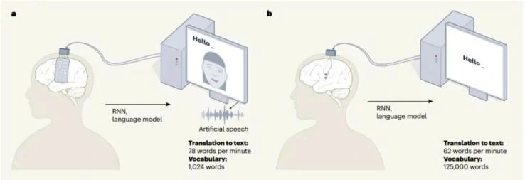 一篇名为《A high-performance speech neuroprosthesis》的文章研究使用了植入的微电极阵列(MEA)识别受试者说话时口面动作相关的脑区神经信号,经机器学习模型解码,最终令受试者可以以每分钟62词的速度与人交流,这是以往同类技术最高速度的3倍,已经大大接近了无语言障碍者的自然交流速度(160词/分钟)。