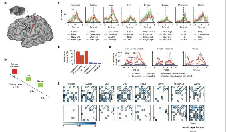 在《A high-performance speech neuroprosthesis》的研究中,团队尝试给运动神经元疾病(运动神经元疾病,也被称为肌萎缩侧索硬化症,这种疾病会导致肌肉逐渐失去控制,导致行动和说话困难,即保留了一些有限的口面部运动和发声能力,但无法产生可理解的言语)患者的大脑体感运动皮层植入了阵列电极(共包含128个电极),用于收集单个神经元活动。参与者在BrainGate2试点临床试验中根究显示器上的提示试图做出个人的口面部运动(图2a,b),说出单个音素或说出单个单词。研究人员记录了四个微电极阵列的神经活动——两个在6v区(腹侧运动前皮层)10,两个在44区(布罗卡区的一部分)。