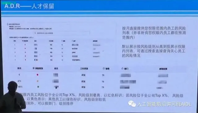 除了招聘和智能人才推荐之外,我们现在还做离职预测。现在离职预测非常精准,比如说在系统里你看到某一个人已经标红了,标红是什么意思?也就是未来三个月他离职的可能性非常大。作为领导,你要考虑的是什么?你想不想挽留他,如果你想挽留他要做什么动作,如果你不想挽留他,要想手下哪些个人可以替换他,这是你要考虑的。
