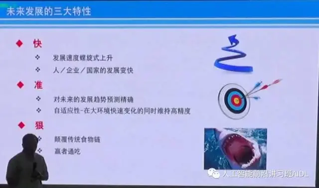 人工智能替换了什么?替换了人的计算能力,替换了人的存储能力,很多以前属于人类的工作现在都是机器在做。未来发展的三大特征:一个是快,一个是准,一个是狠。这是什么意思呢?我们现在整个社会的发展,过去十年的发展比整个人类历史发展的总和还快,非常非常快。这个快会导致什么结果?一个企业的变化、一个组织的变化、一个国家的变化,包括个人的变化,过去一个企业从0到1000亿美元需要花几十年积累甚至上百年积累,现在一个企业从0到10亿美元可能几个月就够了。反之,一个企业从上千亿美元到破产几个月也就够了,所以现在一切都在加快。现在我们对未来的很多判断会变得更加精准,这个精准是因为现在的大数据和我们的分析能力。还有一个“狠”,现在任何一个行业,以前我们有传统的食物链,鲨鱼吃大鱼,大鱼吃中鱼,中鱼吃小鱼,小鱼吃虾米,现在鲨鱼把所有东西都吃掉,所以这是一个非常狠的时代,这个时代中一定要提升自己的竞争力。