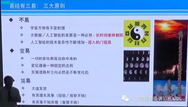 做数据挖掘越做到最后,发现当年在深圳看的《易经》有用,因为这可以指导我很多的思维方式和哲学思想,包括我的很多算法设计都是从《易经》思想中来的。《易经》很简单,《易经》追求的是什么?《易经》追求的三易,不易、变易和简易。我们做很多模型的设计,我们预测模型,首先考虑的是不易,因为建立模型的时候只能把握不容易随着时间改变东西,你需要把握事物之间最根本、最本质,不容易随着时间、地点改变的东西,这就是《易经》“不易”的精神。易学本身就是对大自然观察总结的一些结果。