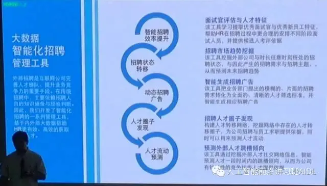 我们通过收集简历,通过收集所有的信息,可以找到每个人的能力,不只是你的专业技能,还包括了你自己的领导力、情商这些所有的东西,这涉及到很多自然语言处理的东西,包括简历的自动收集、整理这些情况。