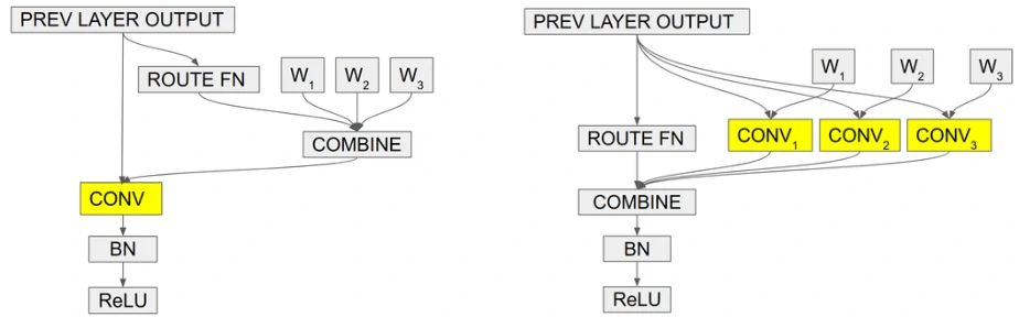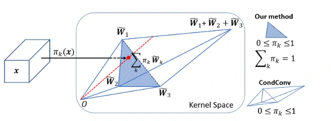 在常规卷积中,卷积核参数一旦经过训练确定以后,无论输入什么样本进行测试,都会利用固定的参数取提取特征。而CondConv中,卷积核参数可以针对输入样本进行动态变换。其次,常规卷积的容量提升依赖于卷积核尺寸和通道数的增加。而CondConv中只需要在执行卷积计算之前通过多个expert对输入样本计算加权卷积核即可。CondConv本质上等价于多个静态卷积的线性组合。