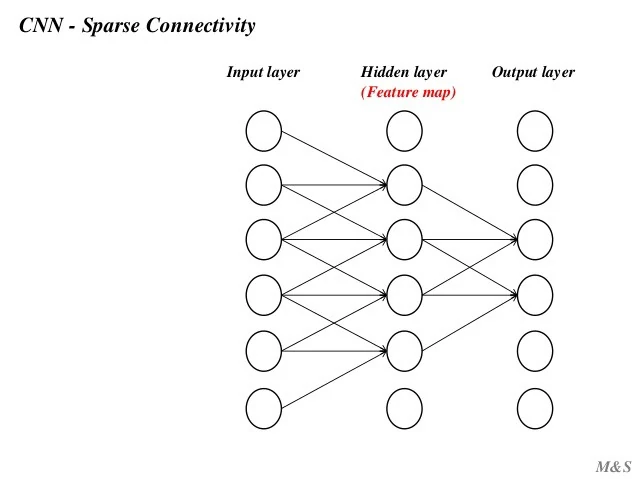 传统的神经网络层使用矩阵乘法,由一个参数矩阵和一个单独的参数描述每个输入和每个输出之间的交互,即每个输出单元与每个输入单元进行密集交互。