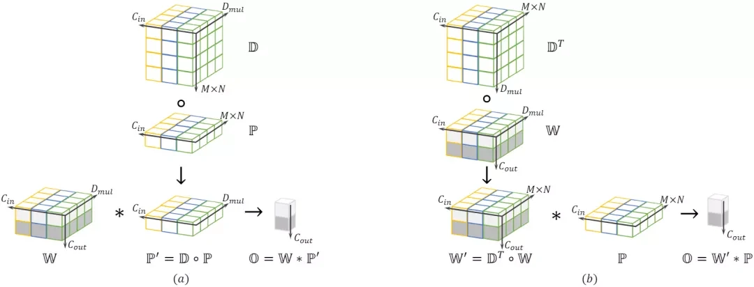 DO-Conv是深度卷积核普通卷积的组合,其计算过程可分为两部分。先对输入特征使用逐深度卷积运算。最后再对输出的中间结果使用常规卷积运算。具体计算过程可参考论文讲解部分。
