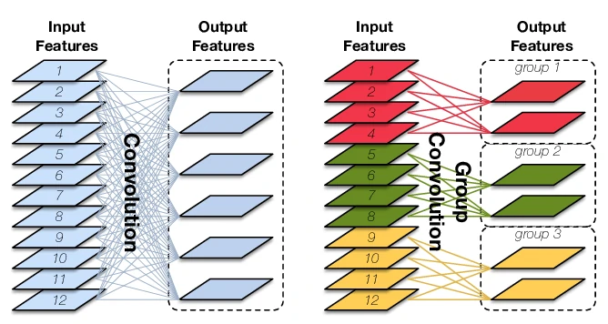 原始卷积操作中每一个输出通道都与输入的每一个通道相连接,通道之间是以稠密方式进行连接。而组卷积中输入和输出的通道会被划分为多个组,每个组的输出通道只和对应组内的输入通道相连接,而与其它组的通道无关。这种分组(split)的思想随后被绝大多数的新晋卷积所应用。