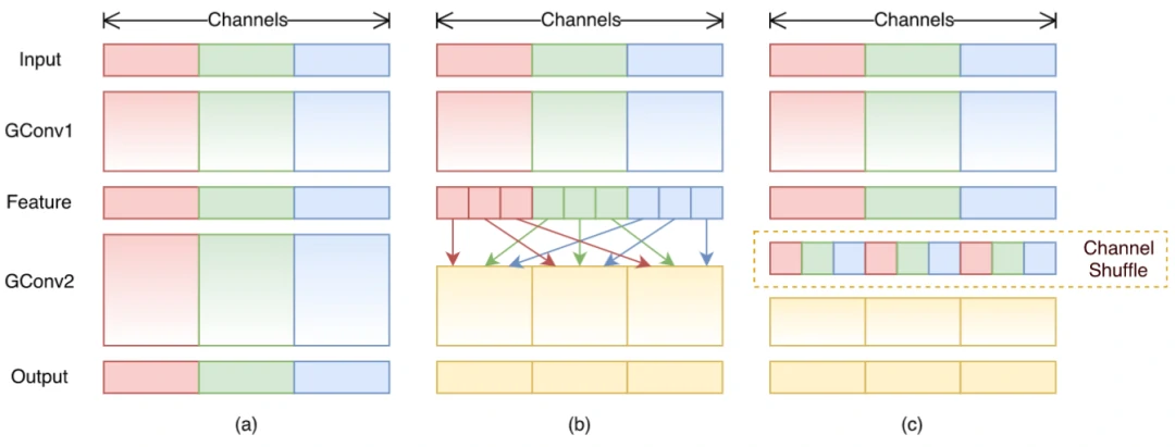 为了解决此问题,**ShuffleNet[3]**结合了逐点组卷积(Pointwise Group Convolution, PGC)和通道混洗(channel shuffle),来实现一个高效轻量化的移动端网络设计。