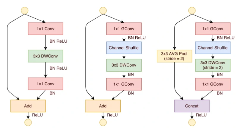 单纯地应用PGC虽然可以有效的降低计算复杂度,但同时也会引入副作用(组与组之间的信息无交互)。因此,作者进一步地应用通道混洗操作来促使信息更好的流通。最后,论文中也提出了一种Shuffle单元。