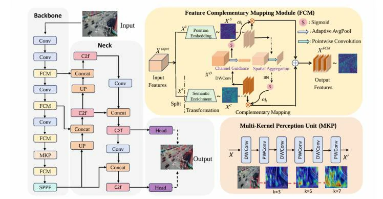 为应对航拍图像目标检测中的挑战,本文设计了一种能够兼顾检测精度与实时效率的有效网络架构。本文提出了一种新型检测网络,包含两个轻量级模块:特征互补映射模块(FCM)和多核感知单元(MKP)。