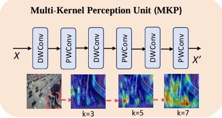 其次,考虑到航拍图像中的小目标通常只占据极少像素,极易在卷积神经网络的特征提取过程中发生信息丢失,我们进一步从网络感受野角度出发,提出了多核感知单元(MKP)。