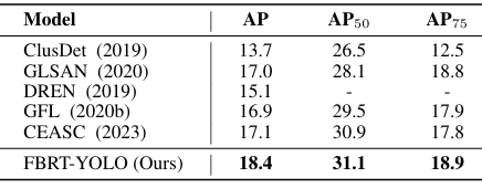 在UAVDT数据集(表 2):FBRT-YOLO的AP达到了18.4%,显著优于之前的多种方法如 GLSAN (17.0%)和CEASC(17.1%),这证明了该方法在不同场景的航拍图像上同样有效。