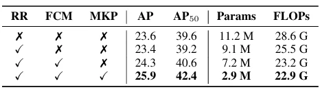 本文还对RR(冗余削减策略)、FCM(特征互补映射模块)、MKP(多核感知单元)进行了消融实验(表 4),